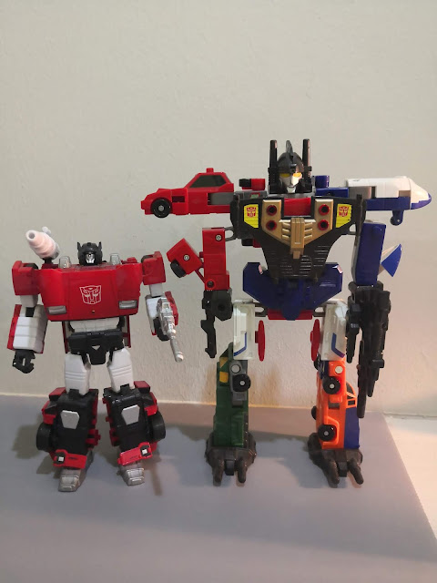 At the back of the box we can see them in action with Metroplex in the background. I'm not aware Metroplex was in the same era as the Multiforce